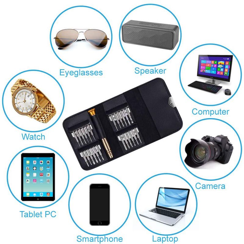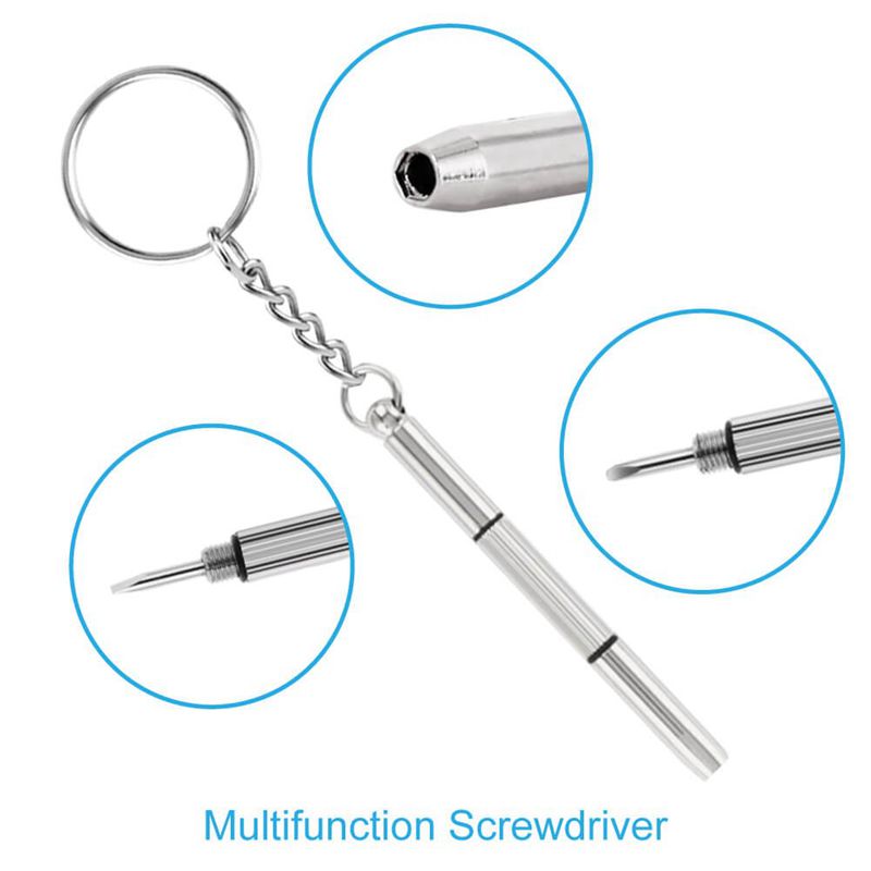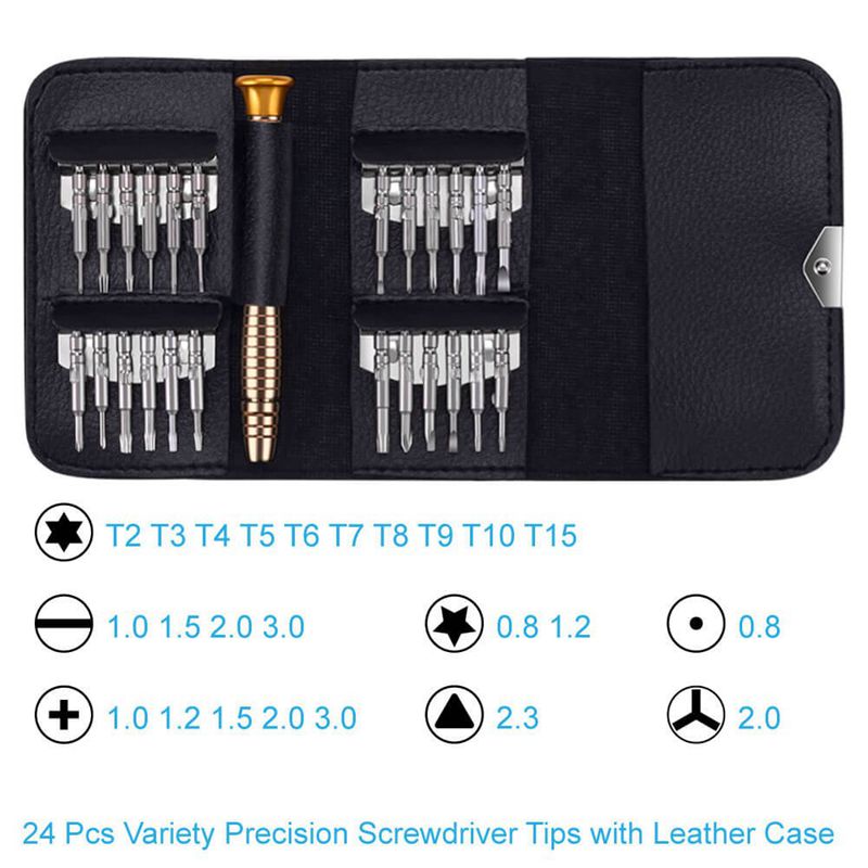 PRECISION MAGNETIC SCRE DRIVER: The glasses screws set in this eyeglasses repair kit accompany a metal screwdriver and 24 different sizes screwdriver tips all the tips are magnetic and with sizes engraved on the body. Sturdy and strong for long time use EYE GLASSES SCREW KIT: The glasses repair kit with screws contains 18 sizes eyeglass screws nuts washers screw caps. It is a great selection to replace screws for most eyeglasses and sunglasses EASY TO IDENTIFY: The screwdriver set in this eyeglass repair kit are well packed in a leather wallet case that are designed with clamping holders to keep the batch heads with sizes on neatly arranged display. The tiny screws in this eyeglasses repair kit are placed in a plastic container boxes with grids that printed with sizes information on the cover for convenient identify EXTREMELY USEFUL GLASS REPAIR KIT :The eyeglass repair kit also comes with a multi-function eyeglass screwdriver with keyring for easy carry a tweezers to pick up small parts a pieces of glasses cloth to clean glasses. They are Perfect for eye glass repair and sunglass repair as well as suitable for electronics repair watch repair etc.