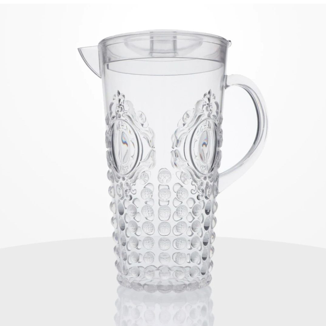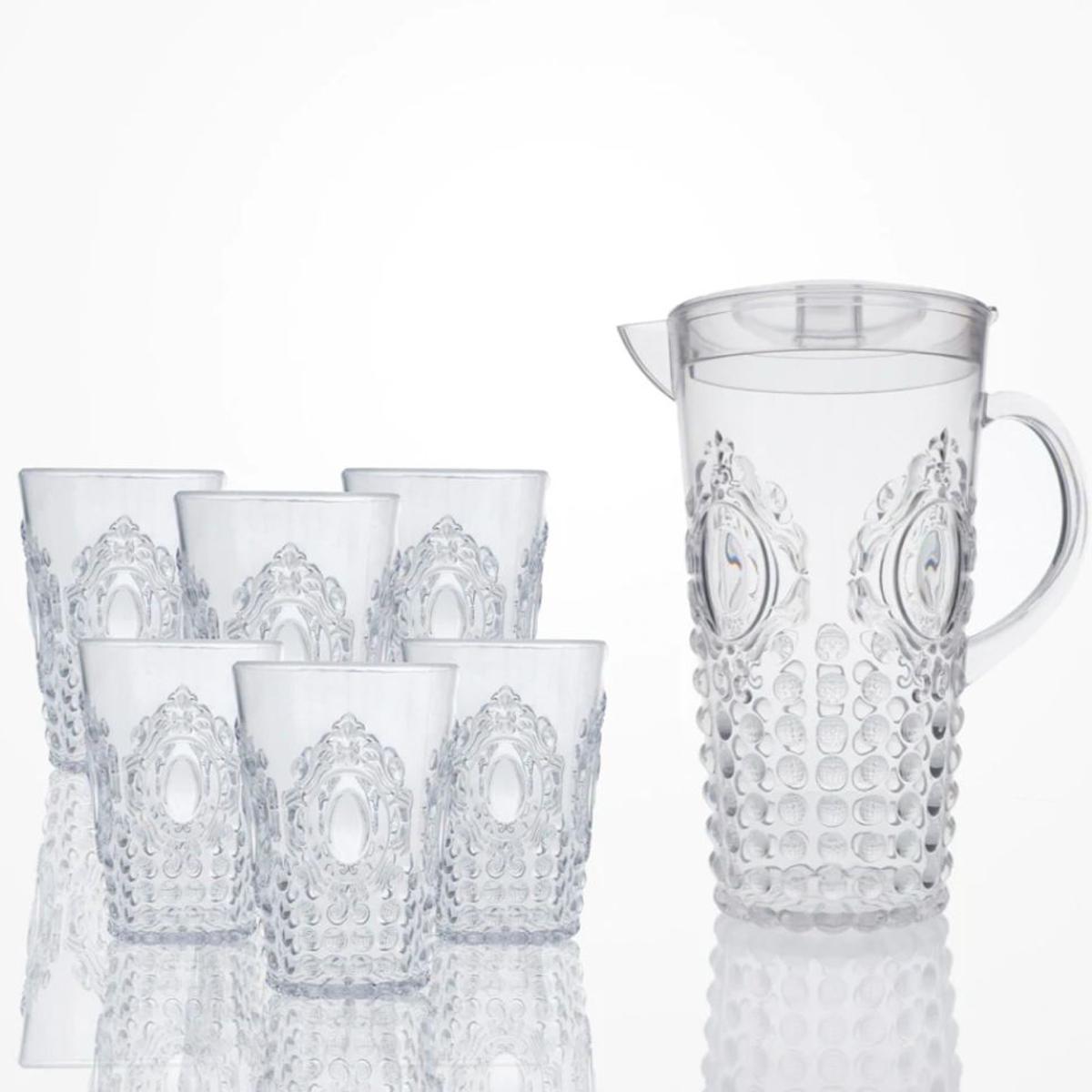 Luxury Crystal (2500ml) Jug and 6 Glass set Water π¦ Jug πΊSharbat Jug Cold Drink jug Stunning Design with Glass like Clarity and Super Glossy finish. Huge capacity of 2.5 Liters & 10 Inch tall design, makes it stand out. Made of Polystyrene (GPPS) Material, which Is FDA approved and BPA Free, Food Safe Material. Packaged in a corrugated box to keep it safe in handling and shipping. Only wash with soft cloth and light detergent to preserve the gloss and shine.