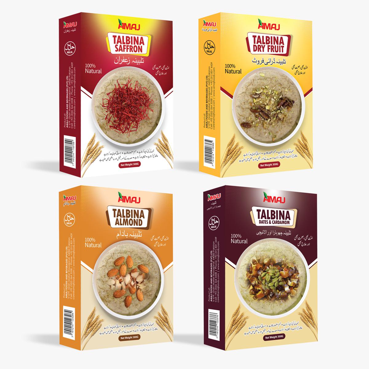Amajfoods offers a pack of four talbina mixes infused with delicious flavors of almond, saffron, dry fruits, and dates. Talbina is a nutritious and wholesome breakfast dish made from ground barley that has been cooked with milk and honey.
