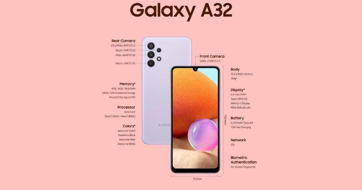 Specifications of Samsung Galaxy A32 – RAM 6GB – ROM 128 GB – Display 6.4 – Multi Quad Camera system – Battery 5000 mAh 1 Year Official Warranty