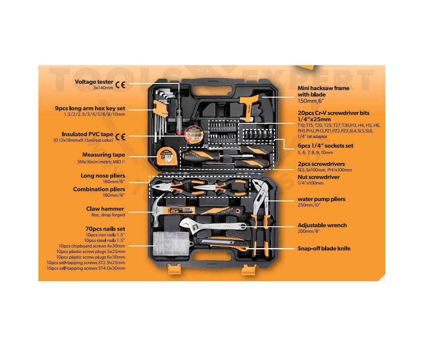 CERTIFIED ORIGINAL TOLSEN BRAND10pcs chipboard screws 4x30mm10pcs plastic screw plugs 5x25mm10pcs plastic screw plugs 6x30mm10pcs self-tapping screws ST2.9x25mm10pcs self-tapping screws ST4.0x30mm1pc measuring tape 3mx16mm9pcs long arm hex key set 1.5/2/2.5/3/4/5/6/8/10mm1pc insulated PVC tape 0.13x19mmx9.15m(red color)1pc mini hacksaw frame with blade150mm,6″1pc slotted screwdriver 5.5x100mm1pc Philips screwdriver PH1x100mm1pc nut screwdriver 1/4″x100mm1pc voltage tester: 3x140mm20pcs Cr-V screwdriver bits 1/4″x25mm:T10, T15, T20, T25, T27, T30,H3,H4, H5, H6,PH1,PH2,PH3,PZ1,PZ2,PZ3,SL4,SL5,SL6,1/4″ bit adaptor6pcs 1/4″ sockets: 5/6/7/8/9/10mmPacking: blow mold case